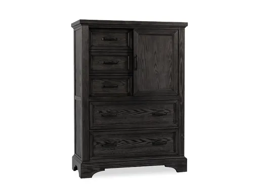 The Prescott Gentleman's Chest is a refined and spacious storage solution for your bedroom, combining contemporary design with practical features. Crafted from poplar solids and oak veneers, the chest showcases a chic gray finish, adding a touch of sophistication to your space. The chest features five drawers, providing ample storage space for your clothing and personal items. The felt-lined top drawer offers a luxurious touch, ideal for storing delicate items. The ball-bearing glides ensure smooth and quiet operation, enhancing the overall functionality. Adding to its versatility, the Prescott Gentleman's Chest includes a door at the top next to the three smaller drawers, offering additional storage options. Elevate your bedroom with this stylish and practical piece, where thoughtful design meets quality craftsmanship for a harmonious and organized space.