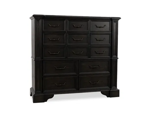 The Duncan Gentleman's Chest offers grand scale, refined storage, and traditional elegance in one commanding piece. Finished in a rich English oak tone, this 13-drawer chest is built from durable rubberwood and accented with oak veneers that showcase the depth and warmth of natural wood grain. Its bold, stately presence and detailed molding make it the perfect fit for classic and transitional bedroom styles. With a structured layout featuring three rows of three drawers at the top and two sets of two larger drawers below, it offers both organization and symmetry.