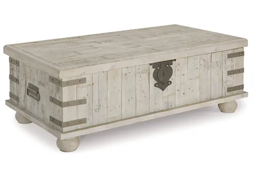 Unlock a quaint touch of farmhouse style and convenience in your living area with the Carynhurst lift top coffee table. Its design is inspired by the rugged looks of an antique storage trunk. Metal keyhole and bracket accents with rivets, a planked effect and large recessed bun feet dress up this charming piece. The distressed light gray finish enhances the reclaimed wood's natural grain, which delivers a naturally aged feel. You’ll love its generous scale, offering a roomy top that's ideal for displaying accents and more. Lift the top and enjoy the accommodating work or dining surface. Under the lift top, there's a fully finished storage area—deeply spacious for organization.