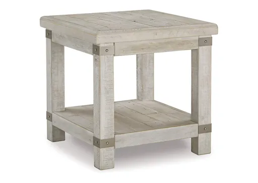 Add a quaint touch of farmhouse style to your living area with the Carynhurst end table. Its beautifully distressed light gray finish enhances the reclaimed wood's natural grain, which delivers a naturally aged feel straight from the countryside. You'll love its generous scale, offering a roomy table top and base shelf that are ideal for displaying accents and more. Large legs, metal accents and the planked effect dress up its country charm.