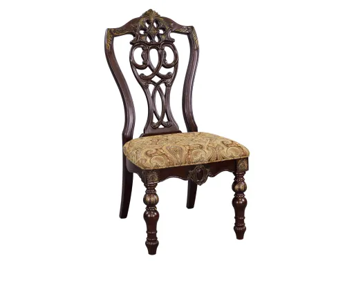 Old-World European styling is captured in the dramatically elegant Bracco Dining Chair. Traditional design elements reign at every turn – egg and dart molding, acanthus leaf carving, bead molding, gold tipping and extravagant carvings – creating a sophisticated look for your dining room. The shield back chairs feature elegantly patterned fabric seats. A traditional cherry finish is utilized to highlight the cherry veneer.