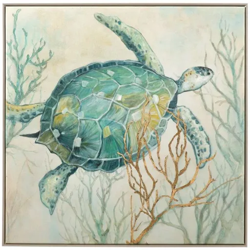 The Alanton framed canvas completes any coastal space with its sea turtle swimming through coral reef. Wrapped in a sleek silver frame for an elegant appeal.