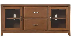 Divide and conquer with the Granthom 60" TV console, crafted of solid poplar with birch veneers. Wood-framed glass doors keep your media equipment visible yet protected, and cable cutouts allow you to snake cords through and ventilate your components. And the adjustable shelf means you can fit the interior space to meet your needs.