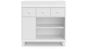 Add unparalleled, modern style and function to your nursery with the Mod changing chest. This stylish, sturdy, 2-tone chest features a changing table topper with two compartments: one for your baby's changing pad (fits all standard-sized changing pads), and to fit your changing essentials. In addition to the changing table topper, this piece features two spacious drawers (complete with euro glide drawer tracks and durable steel hardware), two open storage shelves, and an enclosed storage cabinet with two adjustable-height shelves inside. Crafted from durable engineered wood, the Mod changing chest complies with all applicable ASTM International and CPSC safety standards. Also, the changing topper is JPMA Certified.