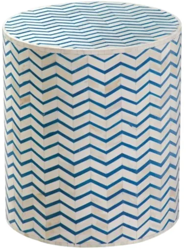 The Aden Scatter Table is a round scatter table with a chevron patterning alternating natural bone and blue resin. The hand-crafted details produced by a skilled artist lend themselves to a unique technique and will vary slightly.