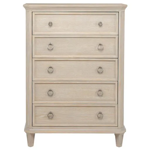 Made with oak veneers, the Weston Chest is elegant, sophisticated, and unique. This beautiful bureau boasts five storage drawers, offering plenty of space for your clothes. Its raised frame moldings, French country style, and tapered wooden legs are sure to add a bit of timeless class to the look of any bedroom.