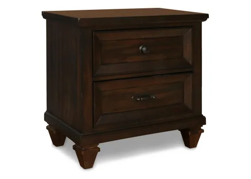 Add the perfect bedside companion to your room with this two drawer nightstand. The felt lined top drawer will help keep delicate items safe and built-in USB ports make it easy to charge devices overnight. Gunmetal gray hammer finished hardware and the tapered feet give this piece a classic look.