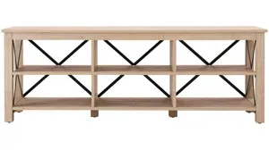 Strong geometric lines set this modern farmhouse-inspired Curlew 68" TV stand apart. Its X-shaped black metal accents offset the rich wood tone, creating a warm neutral color palette that will blend seamlessly into any design scheme. A must-have for living areas and entertainment spaces, this TV stand sets the stage for the big game, a movie marathon, or that season finale everyone's been talking about.