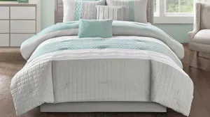 Add a refreshing new look to your bedroom with the Tinsley 8-pc. California king comforter set. Made from ultra-soft microfiber, the seafoam and gray comforter flaunts a piece design with pleated accents that add dimension and charm. Quilting and pintuck details create a beautiful textural look and feel, while a solid gray reverse complements the top of the bed. The coordinating shams reflect the design of the comforter and seafoam Euro shams with gray flanges complete the chic ensemble. Also included are two Decorative pillows and a solid gray bed skirt that provide the perfect finishes for the bedding set. Machine washable for easy care, this comforter set is sure to brighten up your bedroom decor.