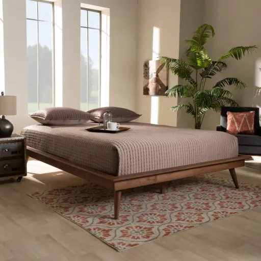 A contemporary rendition of retro mid-century style, the Karine bed frame brings clean lines and warm wood tones into your bedroom. Crafted from sturdy wood, the Karine features a classic Walnut finish that complements any color palette. Its low platform and angled, tapered legs are reminiscent of cool, mid-century modern style. Add some crisp white sheets and a plush duvet to complete the look. This bed includes wood slats, which eliminate the need for a box spring. Available for Online Purchase Only. Ships Directly from the Manufacturer. RC Willey Delivery is Not Available. Assembly required.