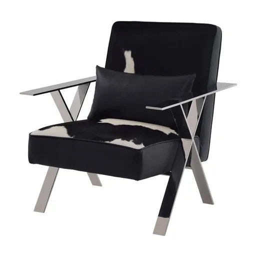 The Cinzia Accent Chair is gorgeous for your home with genuine cowhide leather everywhere the body touches with the natural brindle of the animal print and black and white tones. The X-shaped stainless steel base design of this chair promotes stunning modern design in any room.