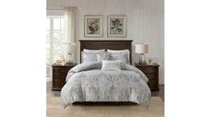 The Hallie 5 Piece Cotton Duvet Cover Set introduces an elegant and traditional allure to your bedroom d_cor. Flaunting a beautiful damask pattern in grey hues with hints of blue and yellow, the oversized cotton duvet cover features a solid grey reverse to complement the top of the bed. Two cotton shams reiterate the damask print seen on the duvet cover, creating a beautiful coordinated look. To complete the bedding set are two decorative pillows with embroidered details provide the finishing touch. Made from soft cotton sateen, this duvet cover set will easily transform your bedroom into a stunning and lavish retreat. Button closures allow you to place a comforter insert within the duvet cover, while internal corner ties prevent it from shifting. This bedding set is also OEKO-TEX certified, meaning it does not contain any harmful substances or chemicals, ensuring quality comfort and wellness.